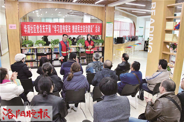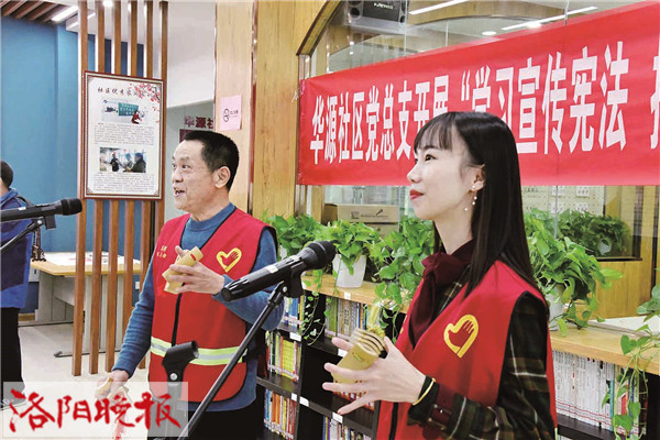? ? 4日,澗西區鄭州路辦事處華源社區在活動中心開展“學習宣傳憲法,推進民主法治建設”活動,社區法律志愿者打起快板說唱憲法內容。朗朗上口的唱詞和舒適的節奏,讓現場觀眾情不自禁地跟著快板打節奏。黨員呂銀娣說:“用這種方式宣傳憲法很接地氣,讓人印象深刻。”