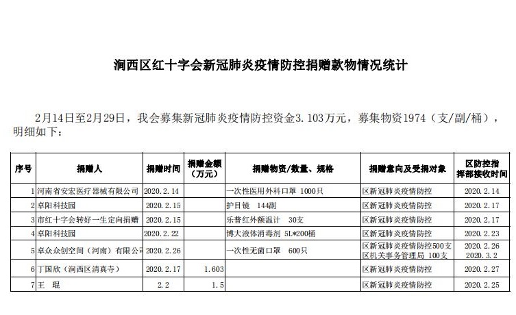 澗西區(qū)紅十字會新冠肺炎疫情防控捐贈款物情況統(tǒng)計(2月14日-2月19日)