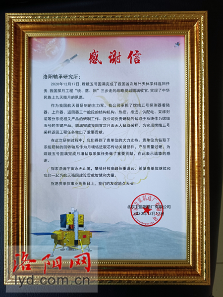 北京衛星制造廠在感謝信中寫道:“貴單位為鉆取子系統研制的回轉軸系作為月壤鉆進取芯傳動關鍵部件,產品質量過硬,為嫦娥五號圓滿完成月壤鉆取采集任務做了重要貢獻,在此表示誠摯的感謝。”(《洛陽日報》2020年11月25日曾刊發報道《“嫦娥”登月采樣配備“洛陽巧臂”》)信中還表示,“希望貴單位繼續與我們一起為航天強國建設貢獻智慧和力量”。