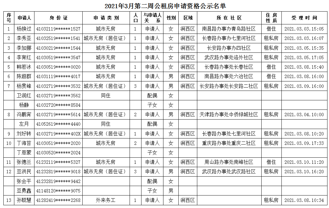 2021年3月第二周公租房申請資格公示名單