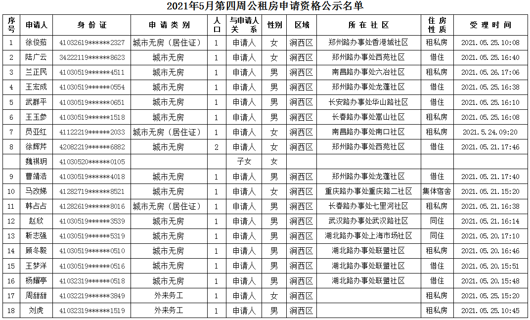 2021年5月第四周公租房申請資格公示名單