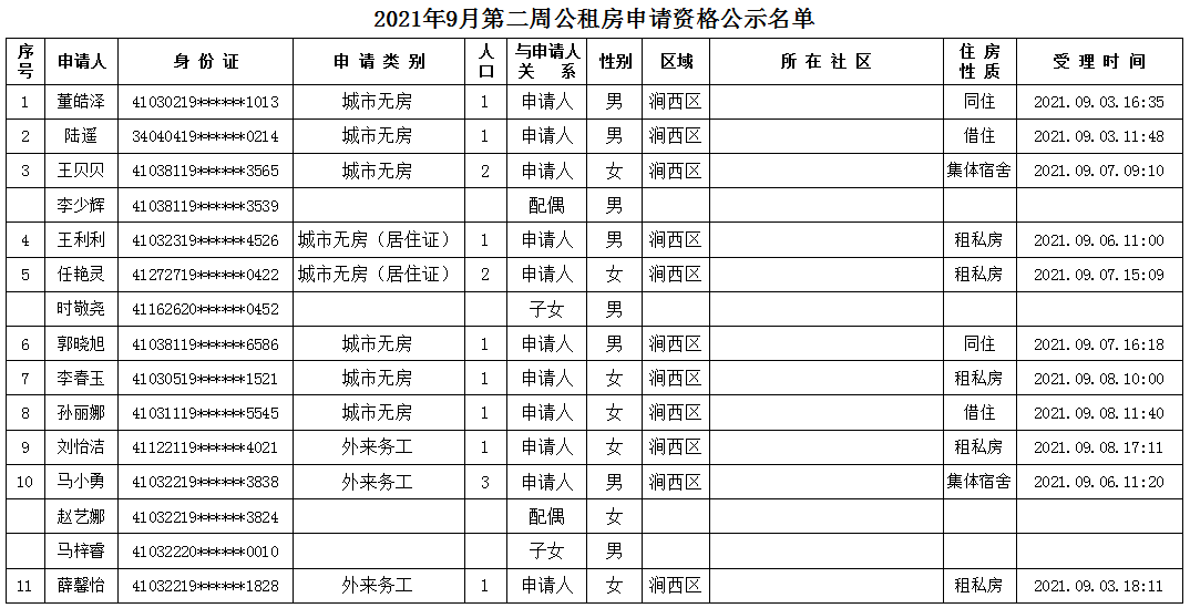 2021年9月第二周公租房申請資格公示名單