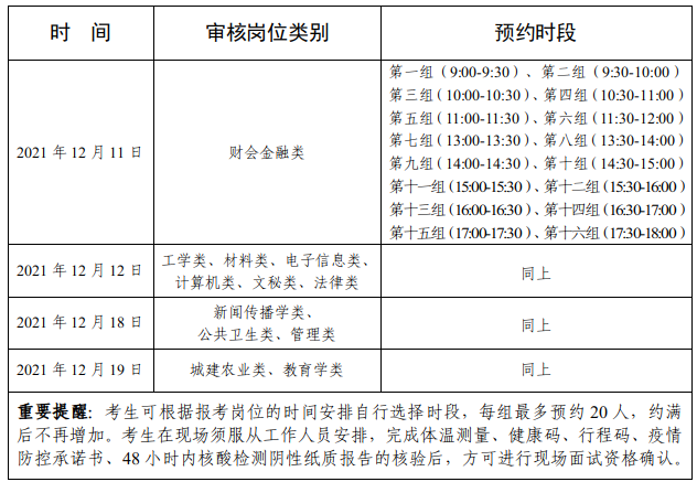根據當前疫情防控形勢需要,為確保人員不聚集、不扎堆,現場面試資格確認采用分散預約制,2021年12月11日、12日,12月18日、19日每天上午9:00至12:00,下午13:00至18:00為面試資格確認時間,請考生按提前預約的時間前往。提前及逾期均不予受理,具體安排如下: