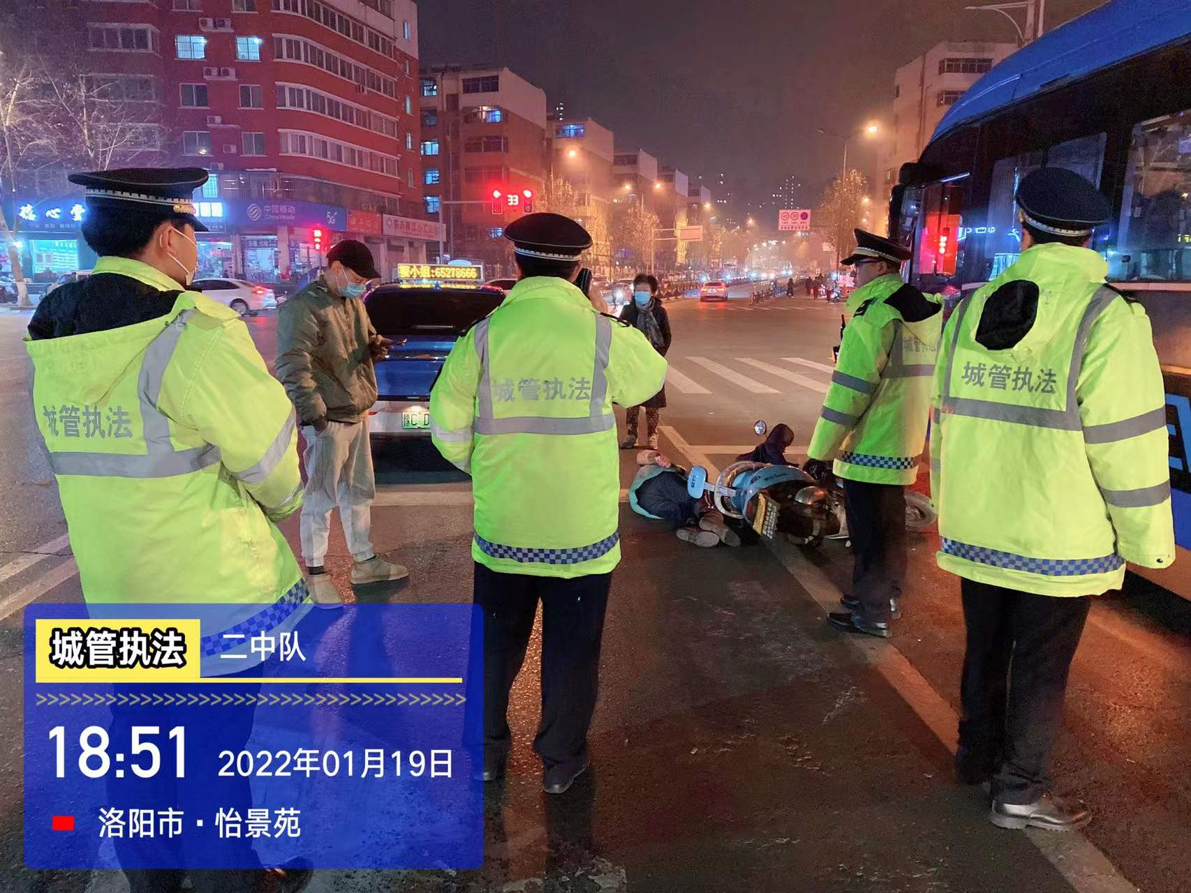 2022年1月19日晚,澗西區城市管理綜合執法大隊違停二中隊李長樂、王宣樂、田楠澤、楊博謙、蔣思源等人在鄭州路聯盟路口向西加油站附近治理違停期間,接到群眾求助,稱聯盟路鄭州路口發生車禍,幾人立刻開車前往現場,發現一輛出租車與一輛電動車發生碰撞,電動車被撞倒在地,車主情況不明。