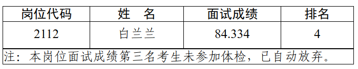 因部分考生自愿放棄考察出現崗位空缺,現從報考同一崗位的人員中,按面試成績從高分到低分的順序依次遞補1名。遞補體檢人員名單如下: