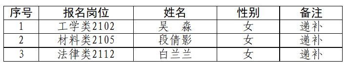 因部分考生放棄考察出現(xiàn)崗位空缺,從報考同一崗位的人員中,按面試成績從高分到低分的順序依次遞補(bǔ)。第三批進(jìn)入考察環(huán)節(jié)人選名單如下: