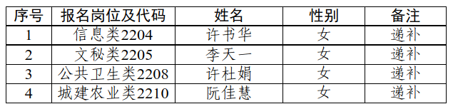 因部分考生放棄體檢、考察出現崗位空缺,從報考同一崗位的人員中,按面試成績從高分到低分的順序依次遞補。第三批進入考察環節人選名單如下: