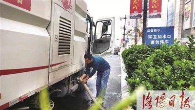 近日,澗西區環衛局機掃車駕駛員張興旺在給機掃車加水。他負責的片區有6輛機掃車,大家實行編組聯合循環作業,人歇車不停,全天作業,“我們試驗過,機掃車按標準對路面沖洗一遍后,單位面積灰塵稱重不會超過10克”。 記者 李東慧 攝
