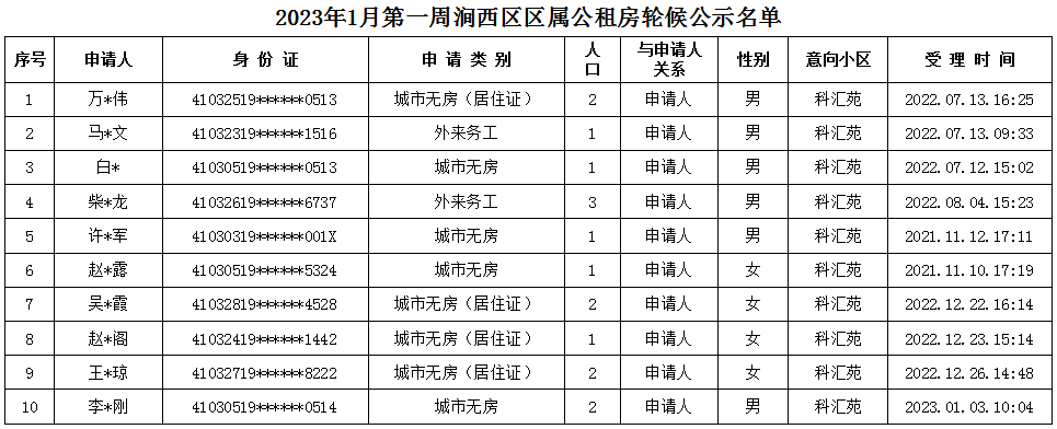 2023年1月第一周澗西區(qū)區(qū)屬公租房輪候公示名單