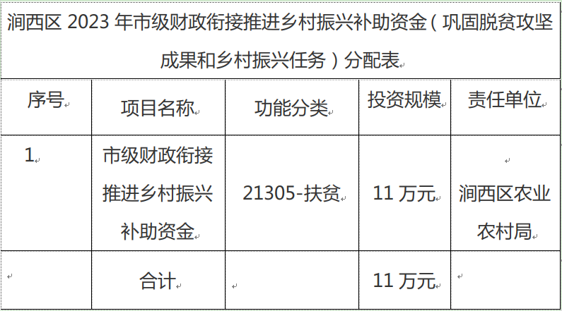 根據(jù)《洛陽市財政局?洛陽鄉(xiāng)村振興局關(guān)于提前下達2023年市級財政銜接推進鄉(xiāng)村振興補助資金(鞏固脫貧攻堅成果和鄉(xiāng)村振興任務(wù))預算的通知》(洛財農(nóng)〔2022〕84號)文件,下達我區(qū)市級財政銜接推進鄉(xiāng)村振興補助資金(鞏固脫貧攻堅成果和鄉(xiāng)村振興任務(wù))11萬元。現(xiàn)將資金分配使用情況公示如下: