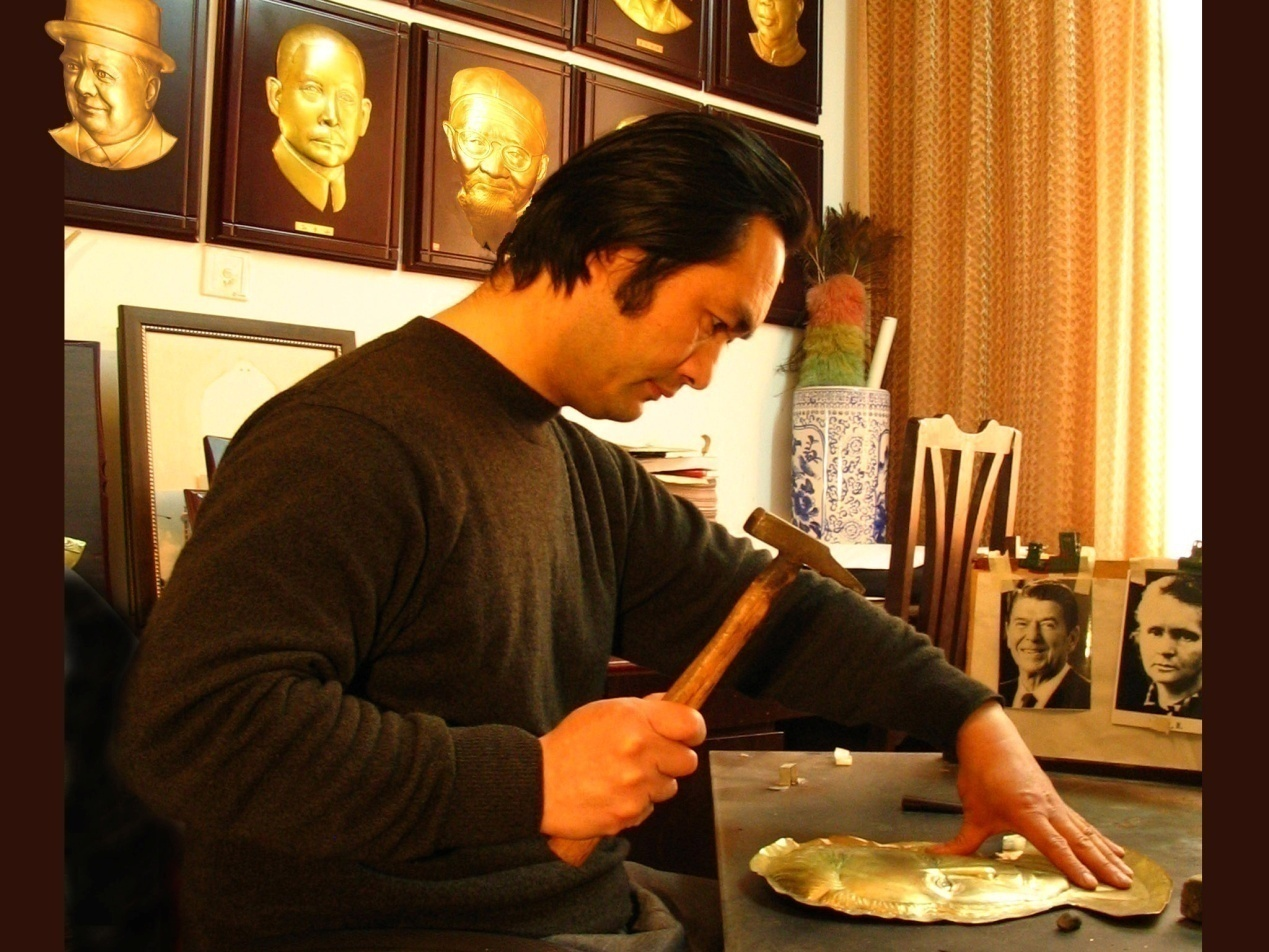 王書品作為該項(xiàng)工藝的代表性傳承人,在對傳統(tǒng)捶鍛工藝?yán)^承和發(fā)揚(yáng)的過程中,除了制作傳統(tǒng)的用具、飾品和雕塑外,還嘗試浮雕人物肖像的制作,歷經(jīng)多年,在將金屬高溫熔煉軋成板后,進(jìn)行手工捶鍛、鏨刻、退火、焊接、打磨、拋光、防腐等數(shù)十道工藝,形成了獨(dú)特的金、銀、銅浮雕人物肖像的捶鍛技法,填補(bǔ)了行業(yè)的空白,許多作品被中外名人和紀(jì)念館收藏。2007年創(chuàng)造上海大世界基尼斯手工鍛打銅浮雕肖像數(shù)量之最(80幅)。其代表性的作品“名人肖像”,藝術(shù)價(jià)值和文化價(jià)值得到了國家的重視,曾被外交部定為國禮,贈給友好來往的國家元首,在中外文化交流中充當(dāng)了和平使者。