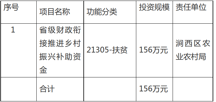 根據《洛陽市財政局?洛陽鄉村振興局關于下達2023年中央和省級財政銜接推進鄉村振興補助資金(鞏固脫貧攻堅成果和鄉村振興任務)的通知》(洛財農〔2023〕29號)文件,下達我區省級財政銜接推進鄉村振興補助資金(鞏固脫貧攻堅成果和鄉村振興任務)156萬元。現將資金分配使用情況公示如下: