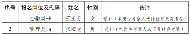 因部分考生放棄考察出現崗位空缺,從報考同一崗位的人員中,按面試成績從高分到低分的順序依次遞補。第三批進入考察環節人選名單如下: