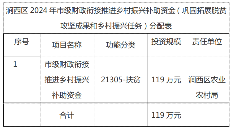 2024年市級財政銜接推進鄉村振興補助資金(鞏固拓展脫貧攻堅成果和鄉村振興任務)119萬元.