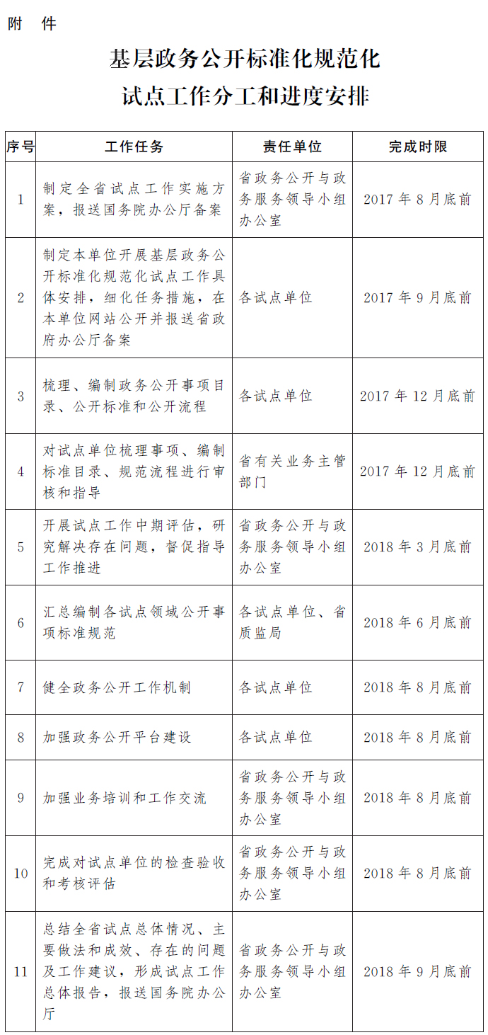 附件:基層政務公開標準化規范化試點工作分工和進度安排國務院關于全面推進政務公開工作的決策部署,圍繞權力運行全流程、政務服務全過程,堅持以公開為常態、不公開為例外,按照“先試點、后推開”的工作思路,立足試點探索、先行先試,全面梳理公開事項、細化公開內容、統一事項標準、規范公開流程,探索建設符合基層特點的政務公開標準和規范,大力推進基層政務公開標準化、規范化,全面提升基層政務公開和政務服務水平。