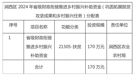 根據(jù)《洛陽市財(cái)政局 洛陽鄉(xiāng)村振興局關(guān)于下達(dá)2024年中央和省級(jí)財(cái)政銜接推進(jìn)鄉(xiāng)村振興補(bǔ)助資金(鞏固拓展脫貧攻堅(jiān)成果和鄉(xiāng)村振興任務(wù))預(yù)算的通知》(洛財(cái)農(nóng)〔2024〕22號(hào))文件,下達(dá)我區(qū)省級(jí)財(cái)政銜接推進(jìn)鄉(xiāng)村振興補(bǔ)助資金(鞏固拓展脫貧攻堅(jiān)成果和鄉(xiāng)村振興任務(wù))170萬元。現(xiàn)將資金分配使用情況公示如下: