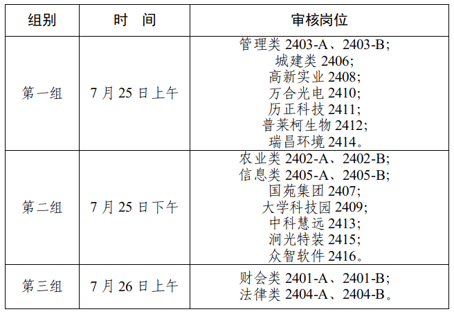 現(xiàn)場面試資格確認采用分組審核制,2024年7月25日~26日上午9:00--12:00,下午13:00--18:00為面試資格確認時間,請考生按規(guī)定的時間前往。提前及逾期均不予受理,具體安排如下:
