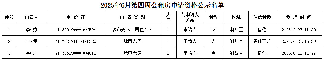 2025年6月第四周公租房申請資格公示名單