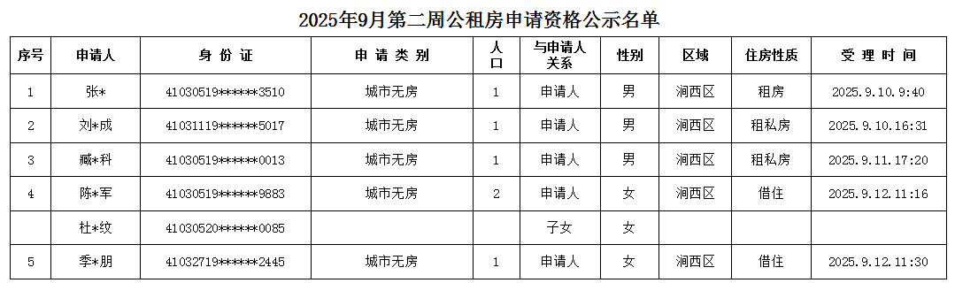 2025年9月第二周公租房申請資格公示名單