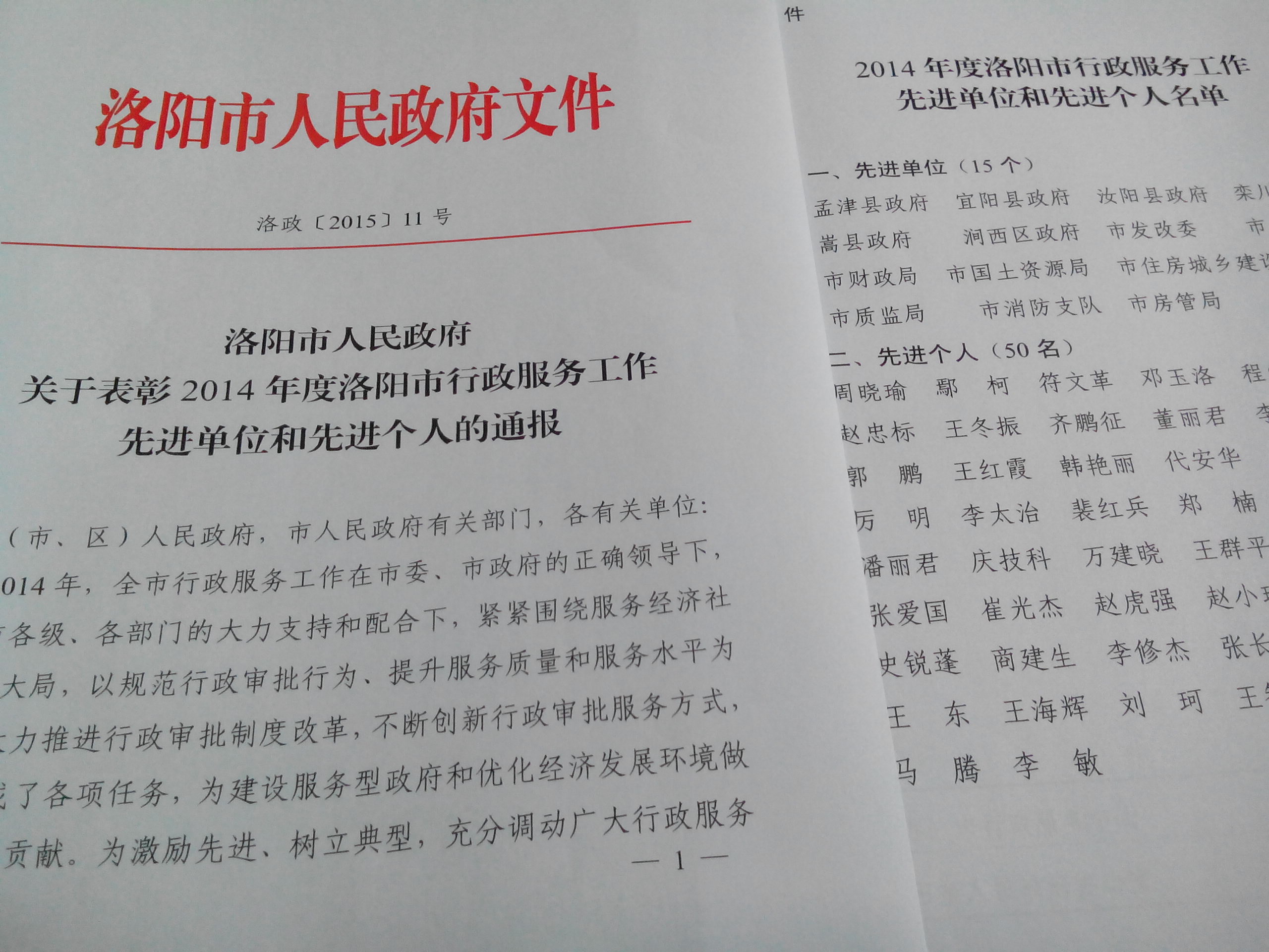 澗西區榮獲全市2014年度行政服務工作先進單位