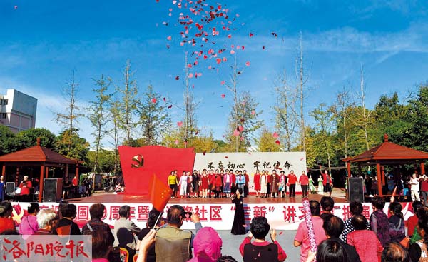 “長江黃河,奔流不息,三山五岳,巍峨挺立……”昨日9時30分,澗西區武漢路社區文化廣場上正在舉行慶祝國慶文藝演出,一名小女孩在現場動情朗誦詩歌。
