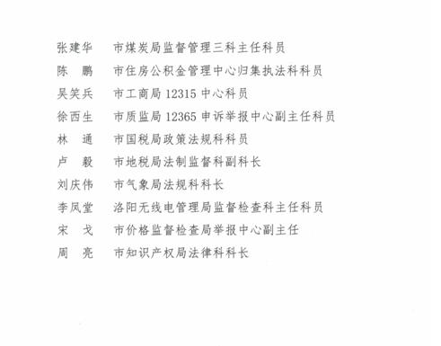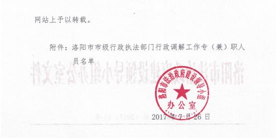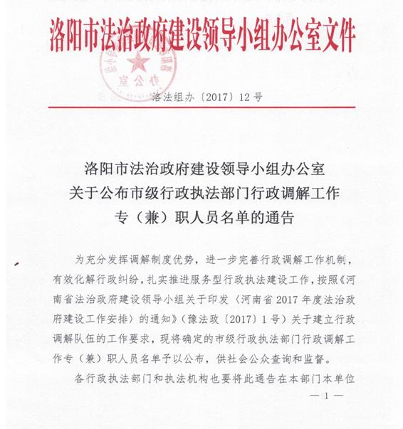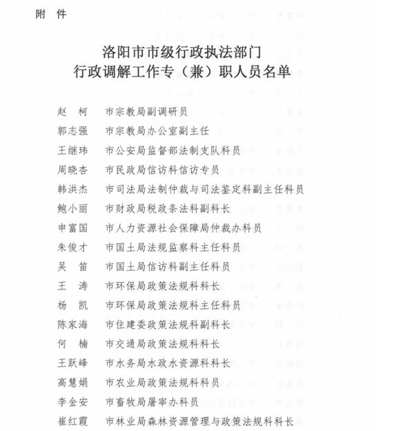 洛陽市法治政府建設領導小組辦公室關于公布市級行政執法部門行政調解工作專(兼)職人員名單的通告